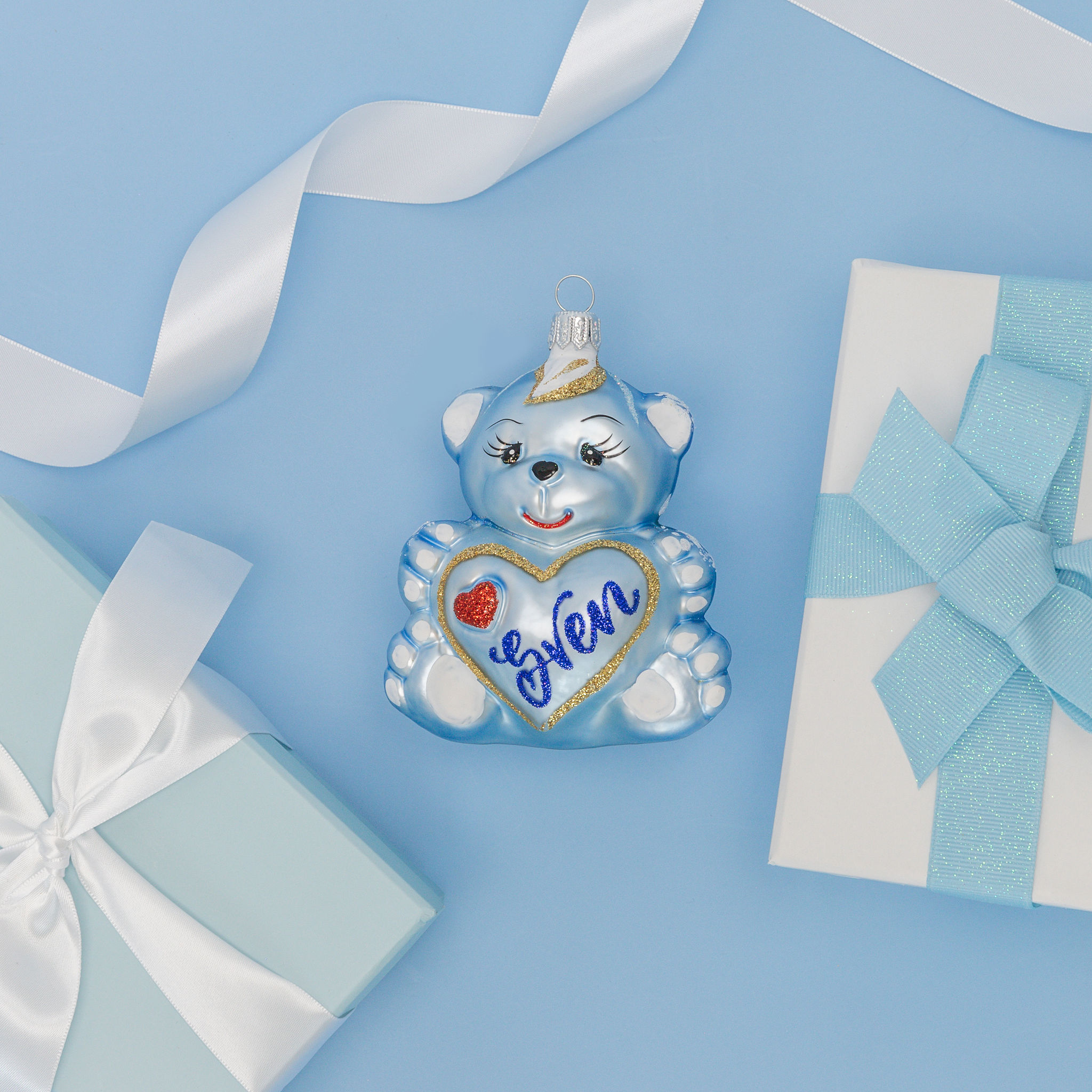 This precious baby-blue glass teddy bear personalised ornament is so cute you won't be able to put him away after the holiday. Customise the back with a special name and this bear will hold it close to its heart all year long. Also available in Pink 9cm. Check Teddy Bear Personalised Christmas Bauble - Baby Pink. Hand decorated. Made in Poland.